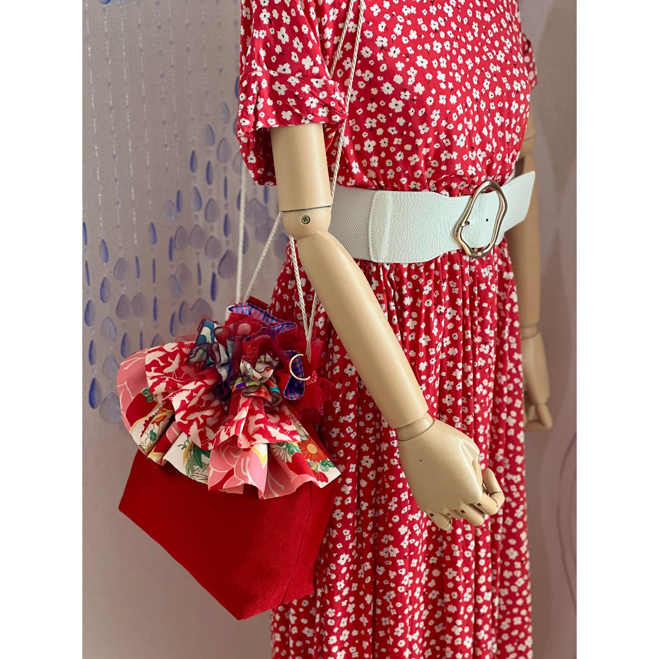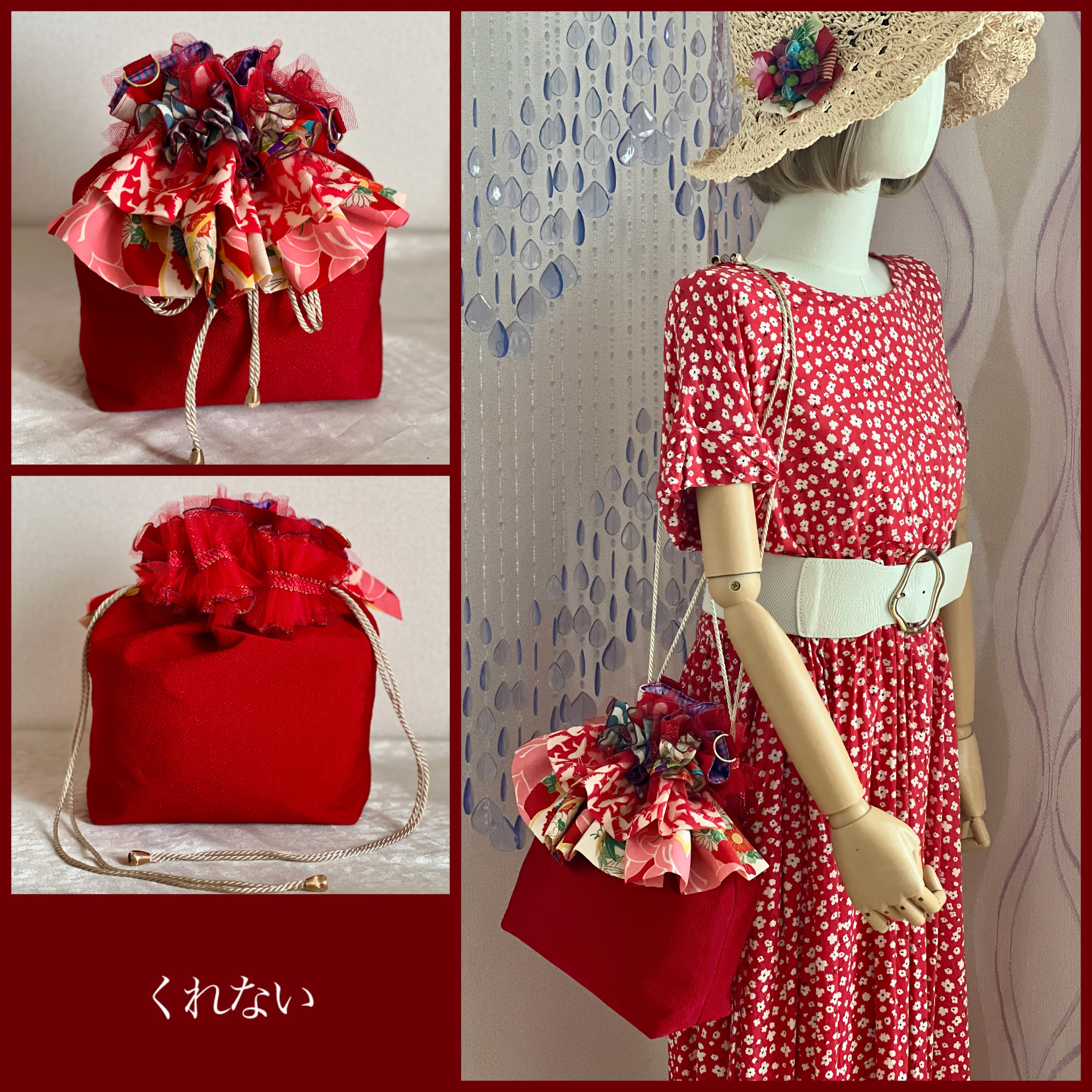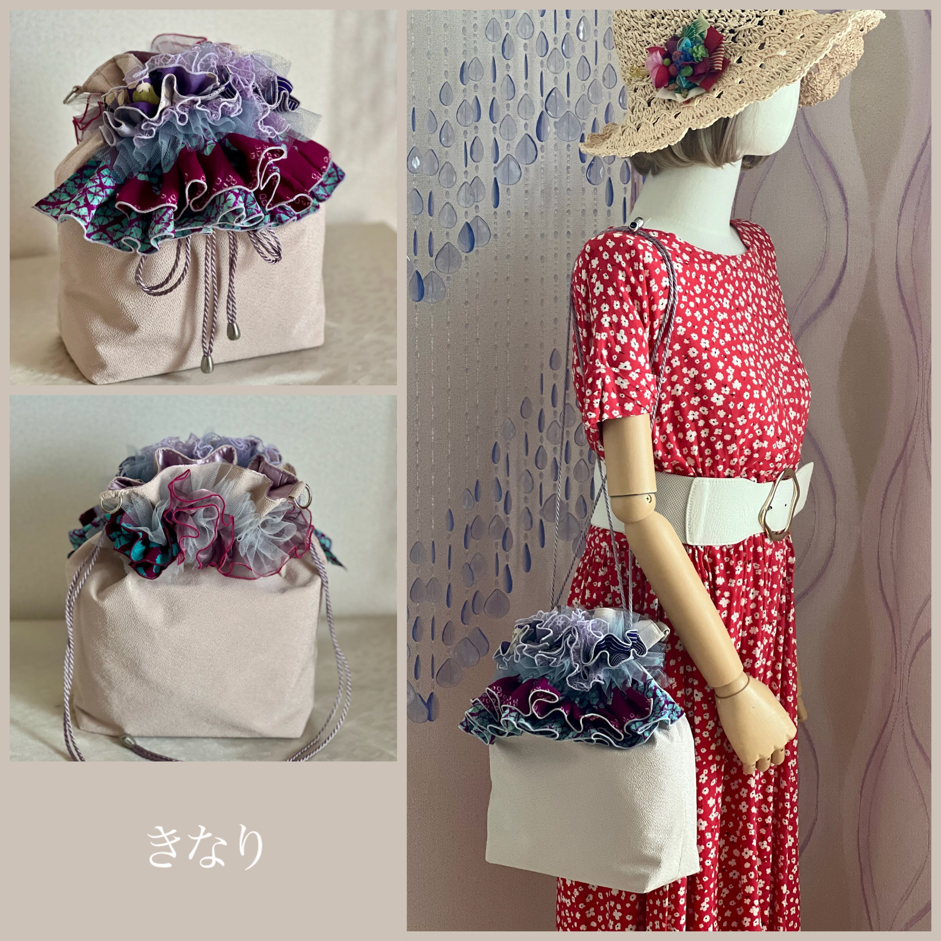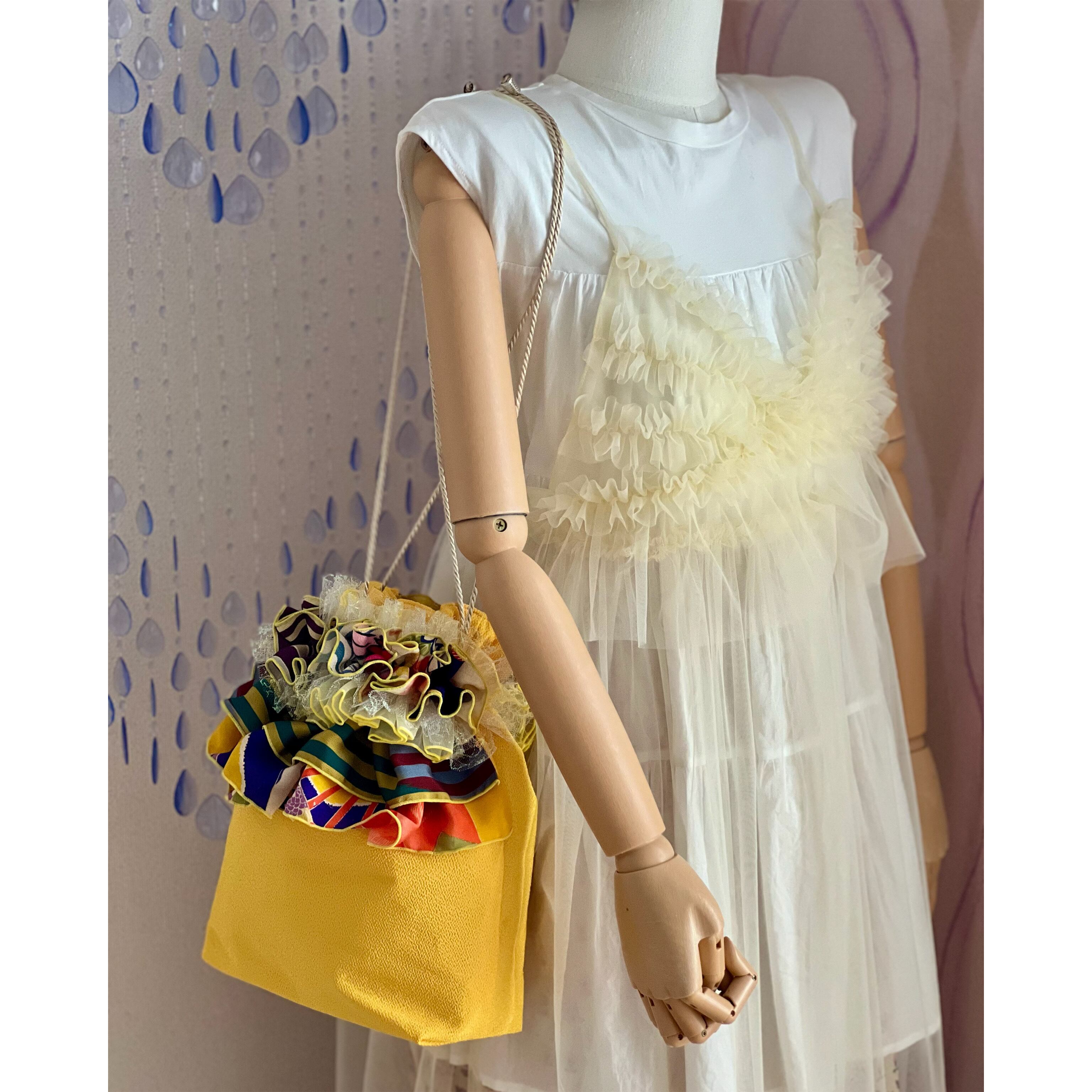 アンティーク着物のハギレにレースを合わせてフリル飾りにしたブーケのような、ギフトバッグのような、一点物のバッグです。