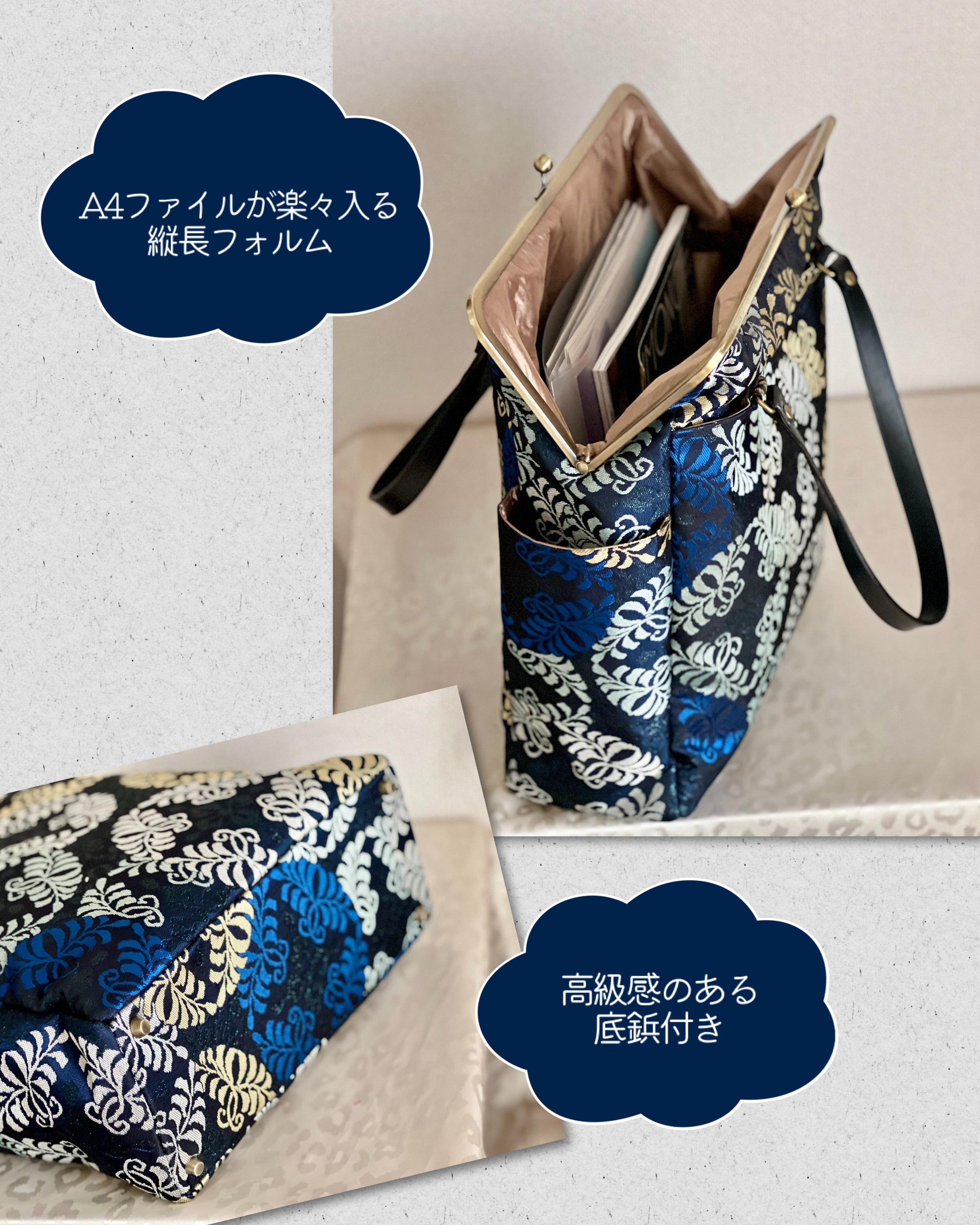 A4サイズのファイルがすっぽりおさまる縦型がまぐちバッグはインパクト大!