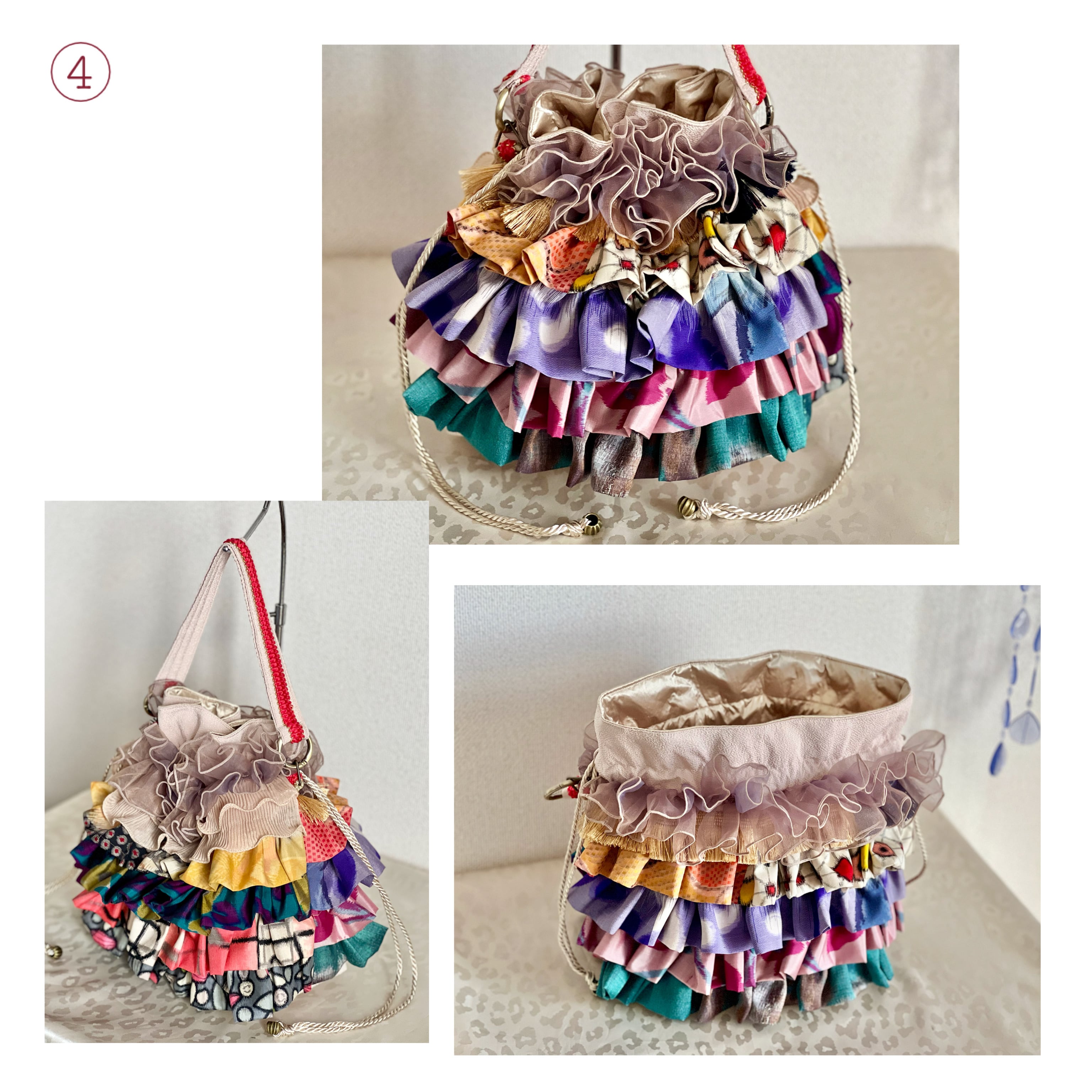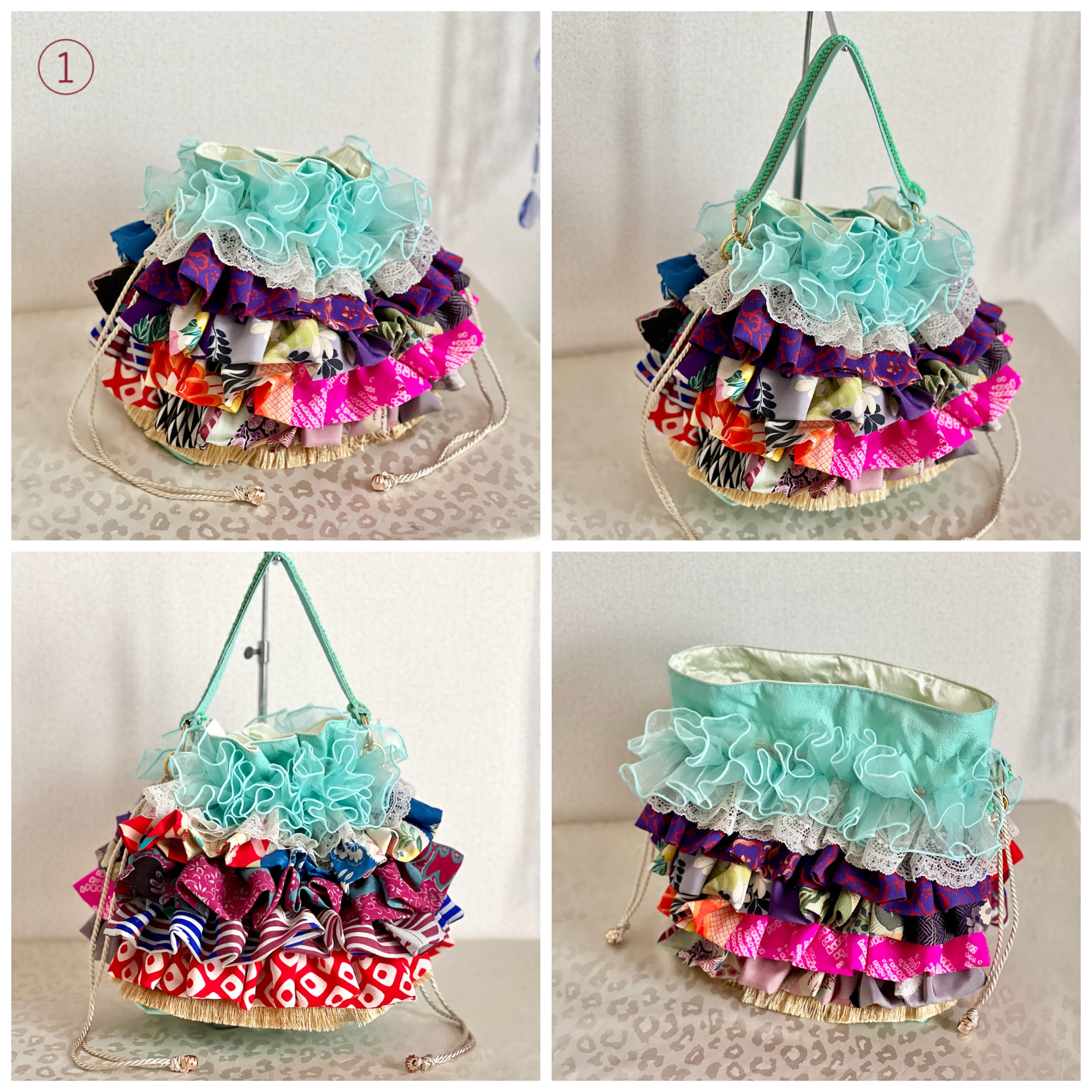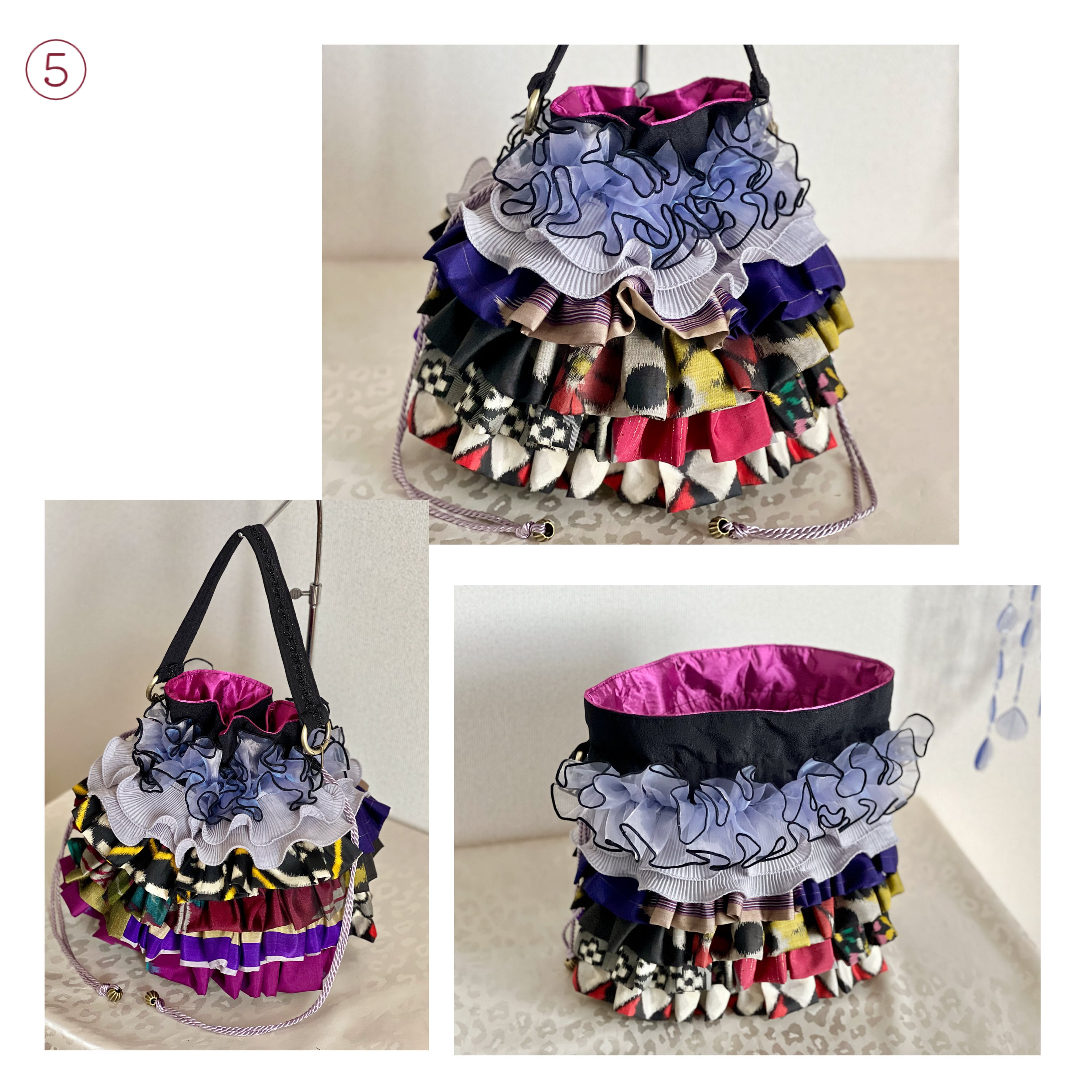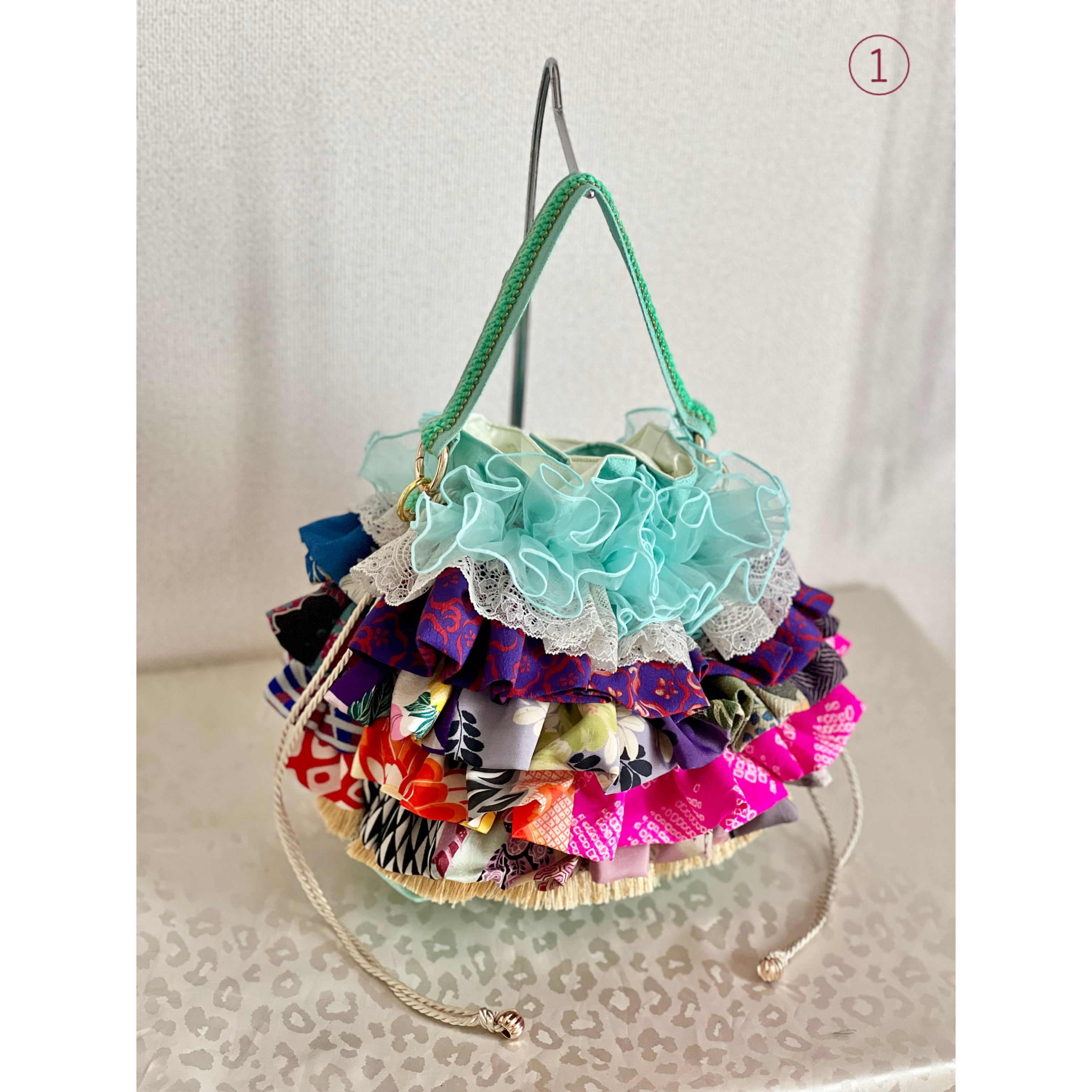 アンティーク着物のハギレなど、厳選古布をたっぷりフリル使いした一点物の特別なバッグが完成。