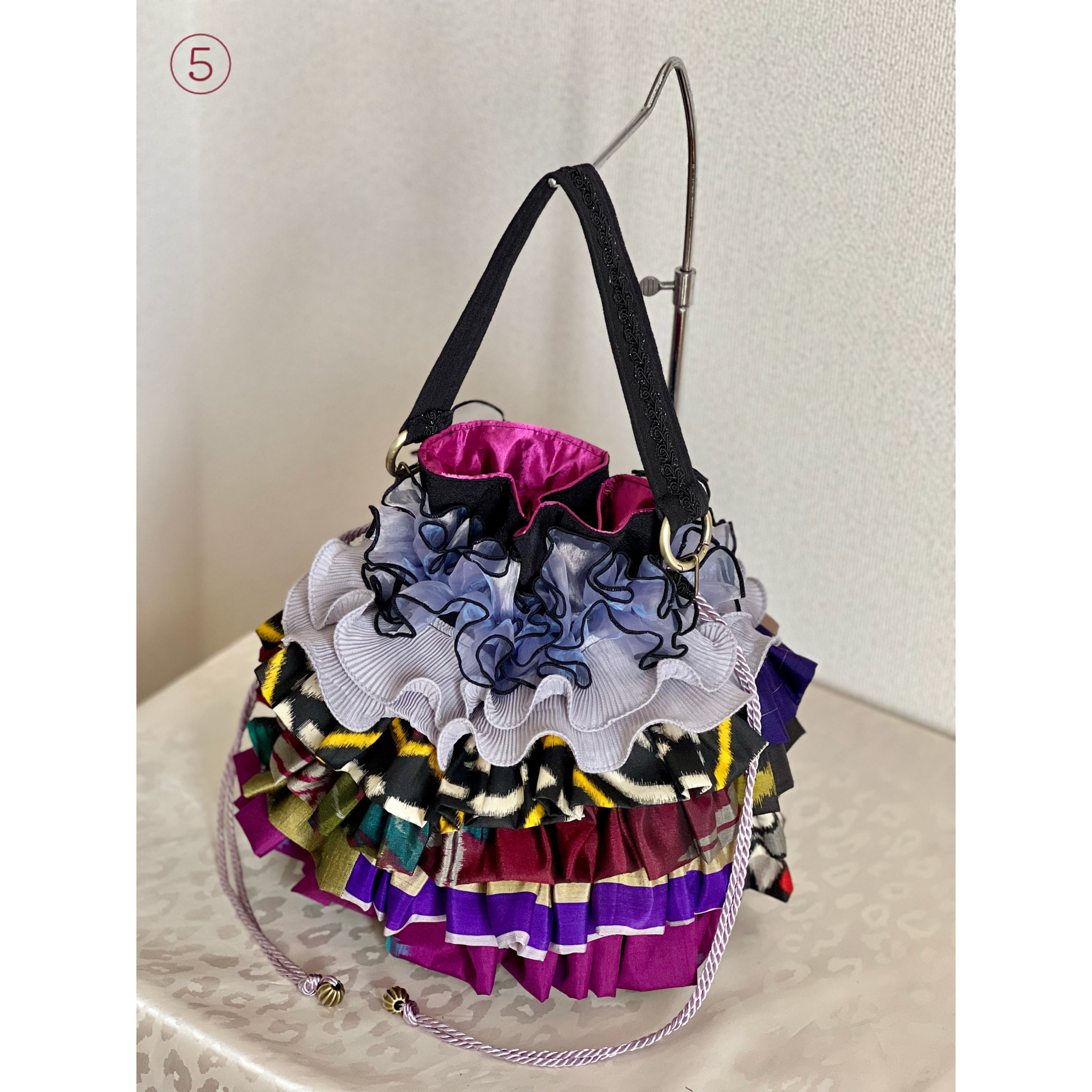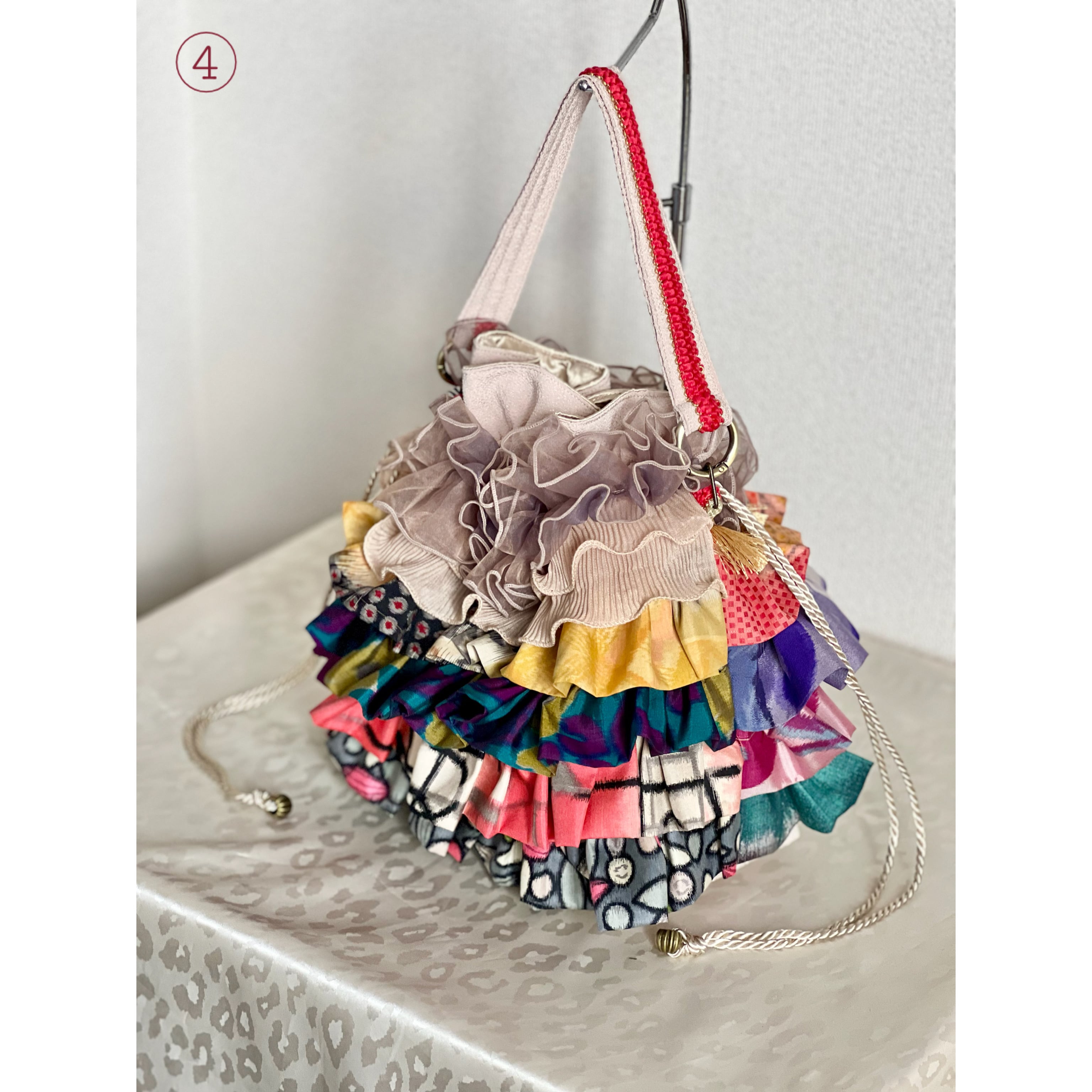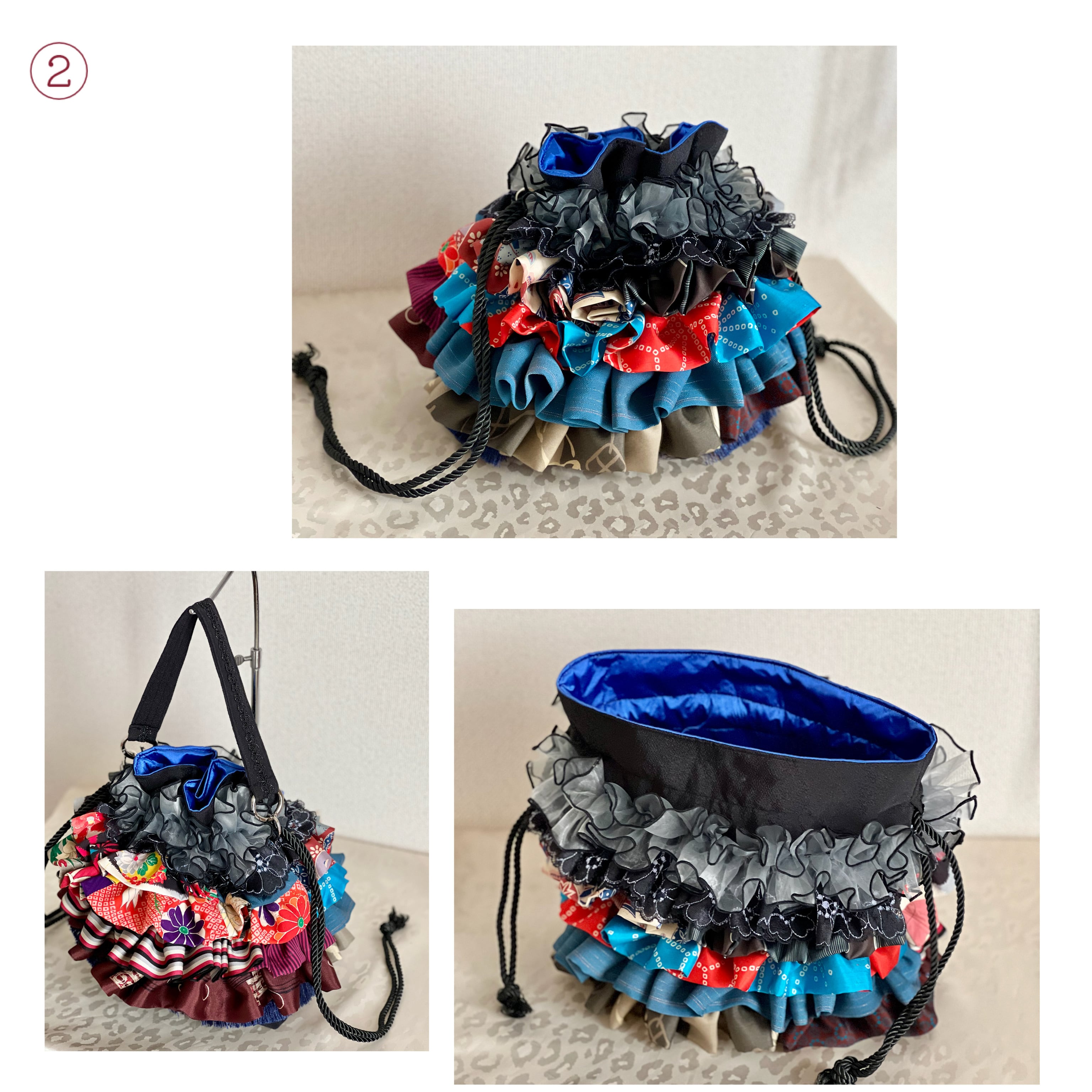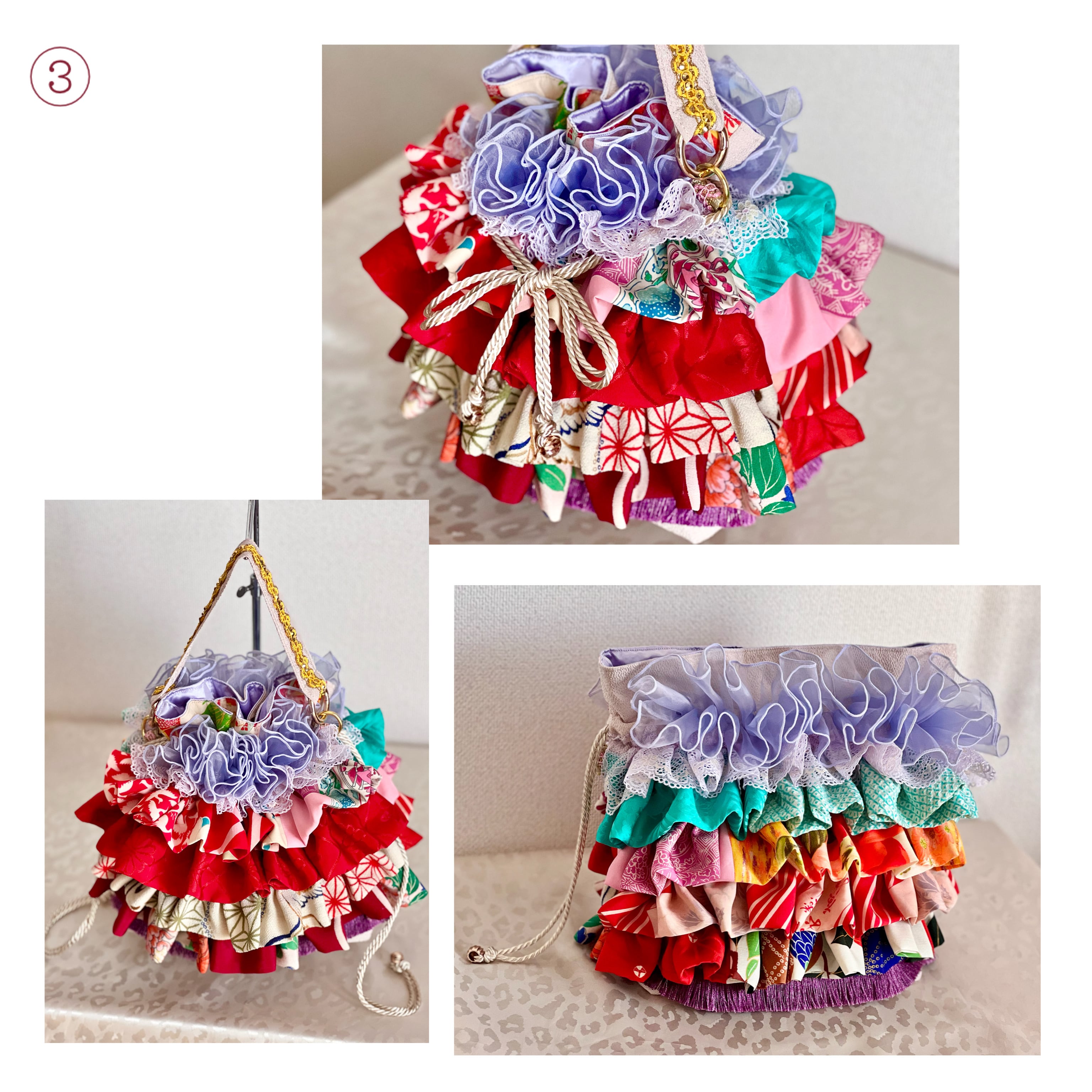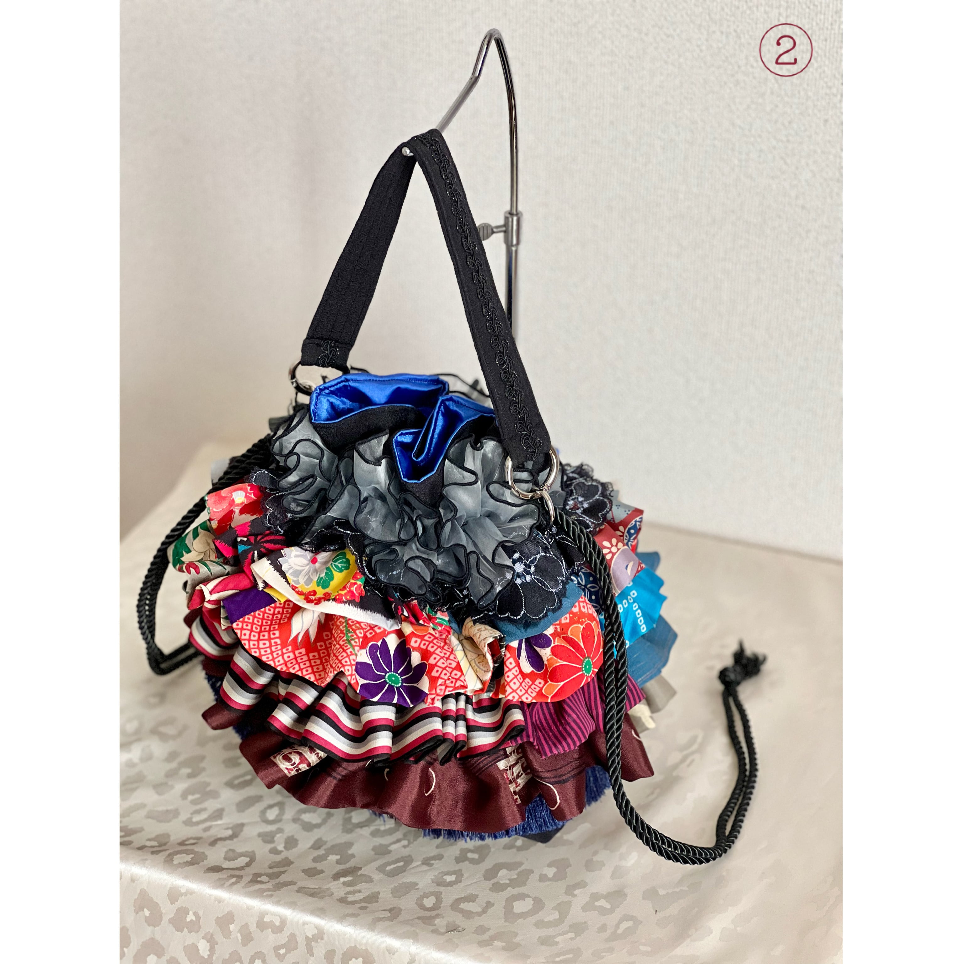 アンティーク着物のハギレなど、厳選古布をたっぷりフリル使いした一点物の特別なバッグが完成。