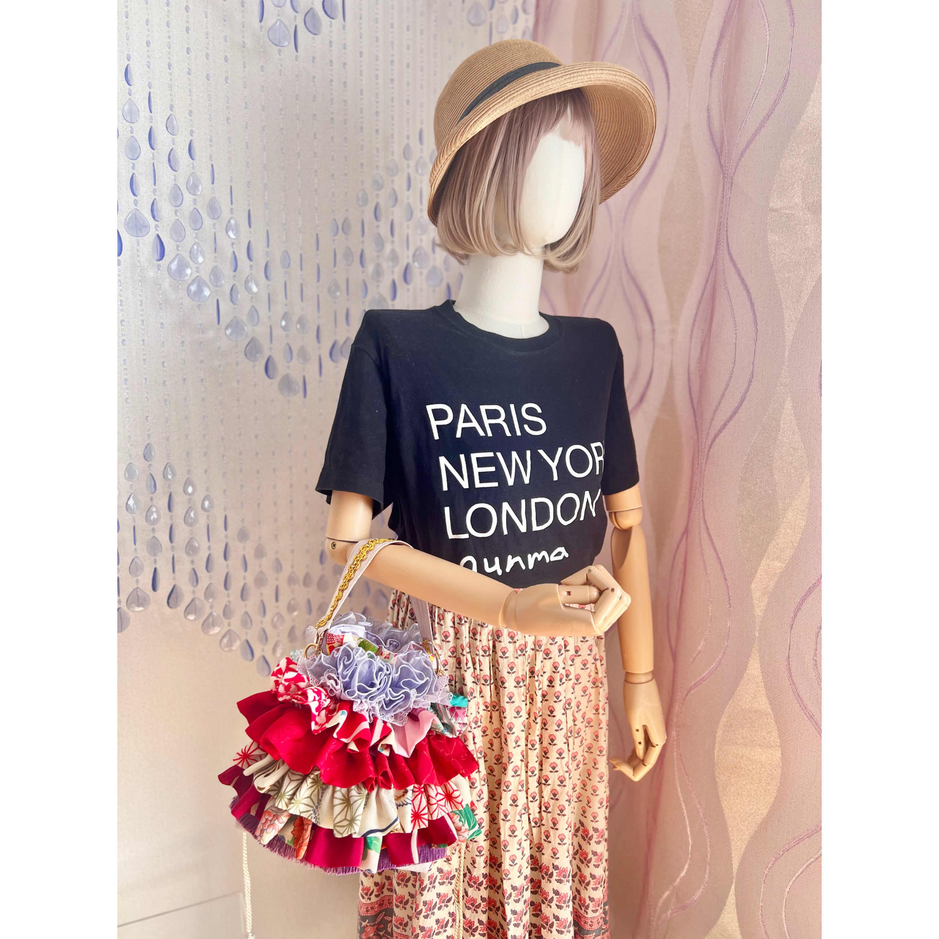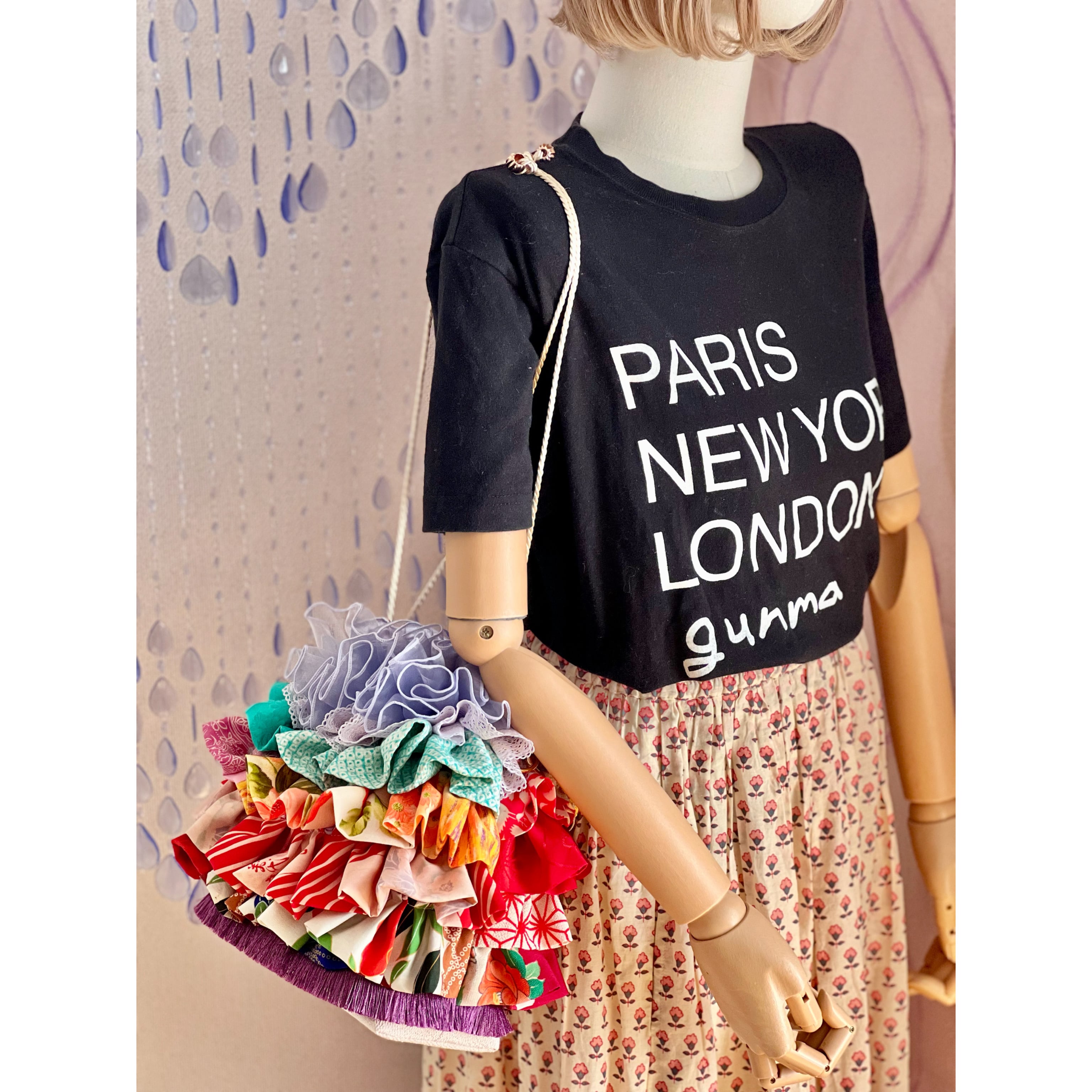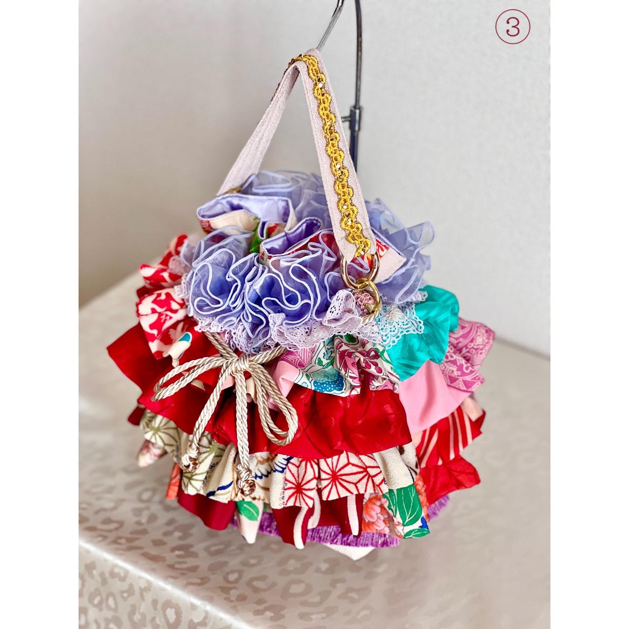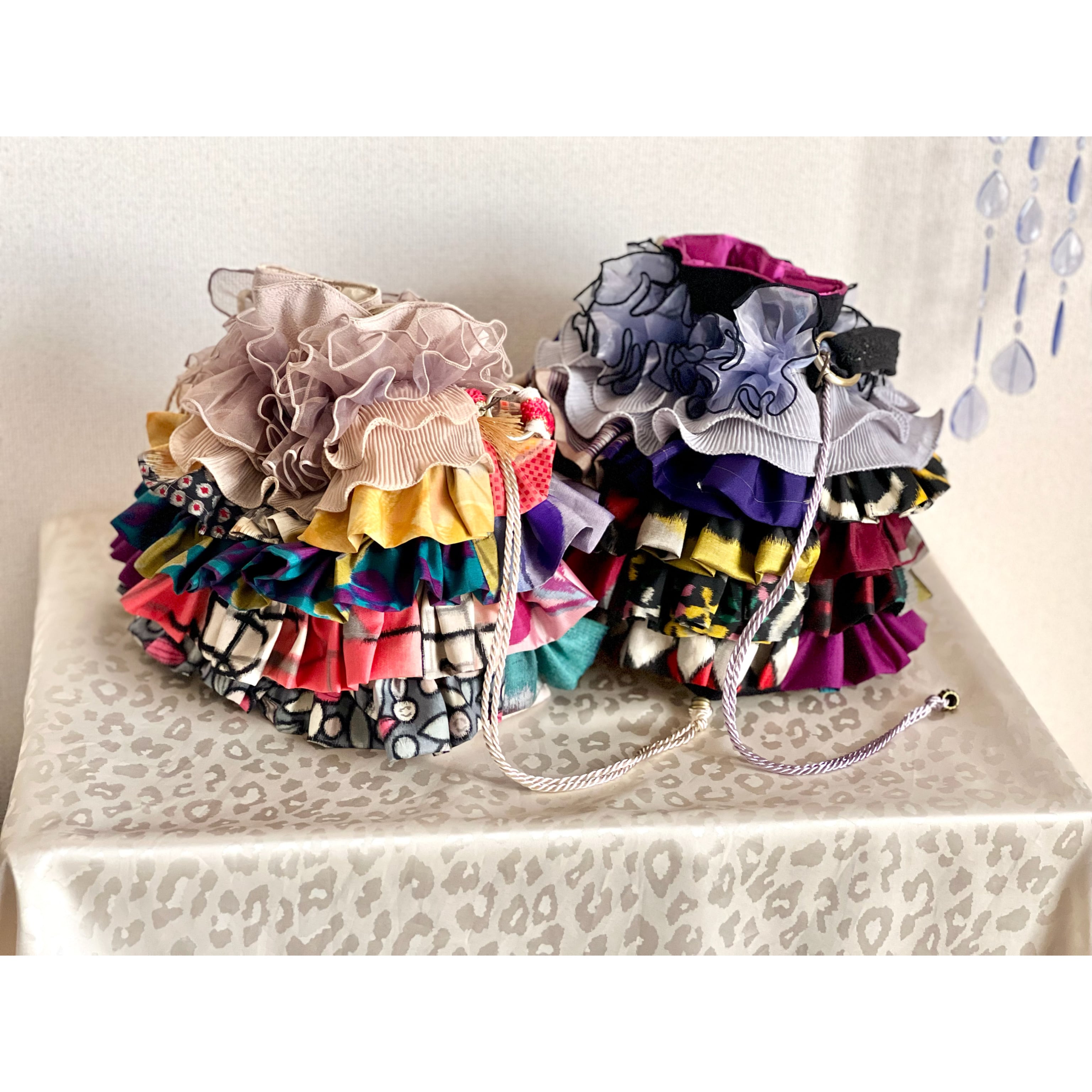 アンティーク着物のハギレなど、厳選古布をたっぷりフリル使いした一点物の特別なバッグが完成。