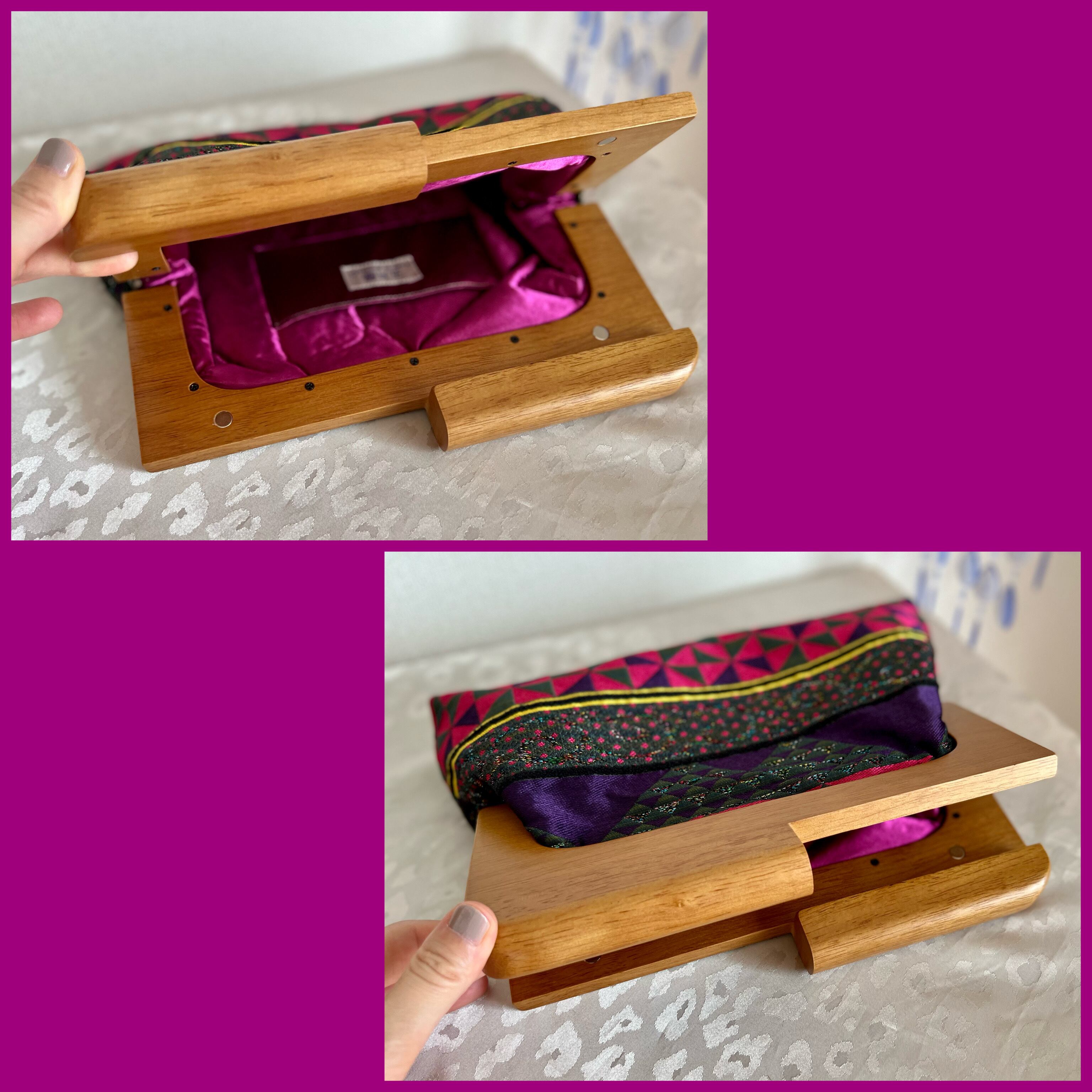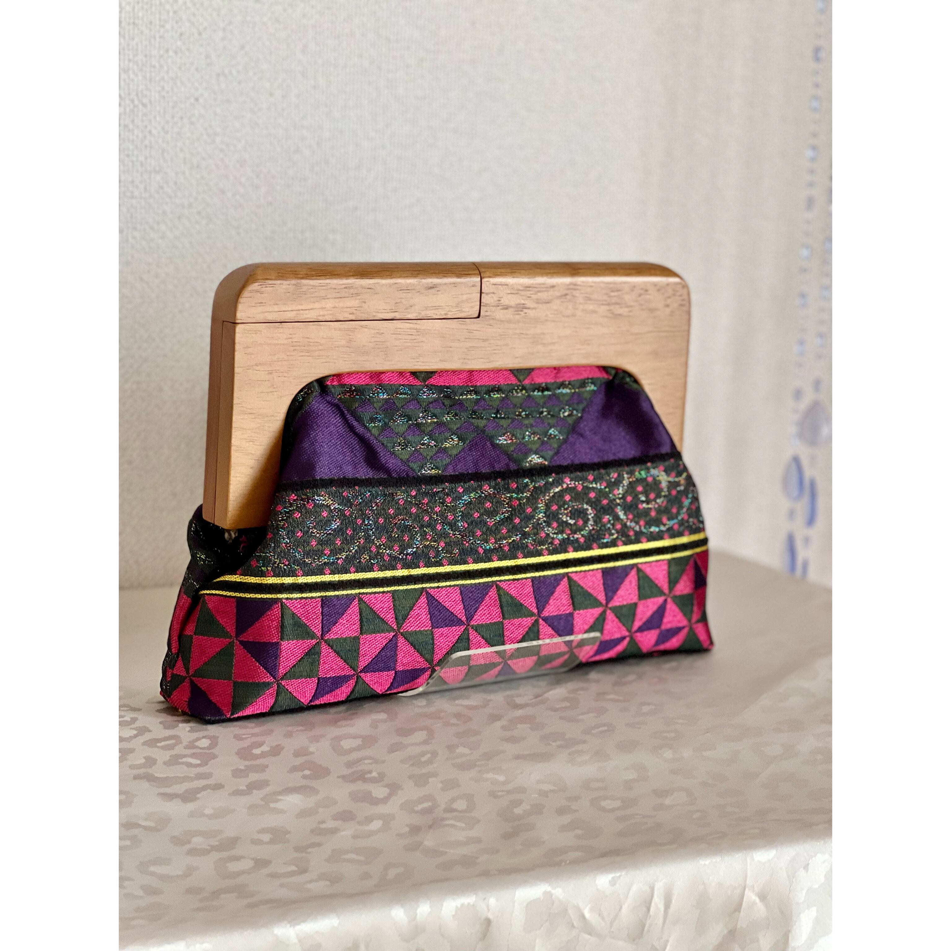 桐生織の帯地を使用した、ちょっと珍しい木製口金のクラッチバッグです。