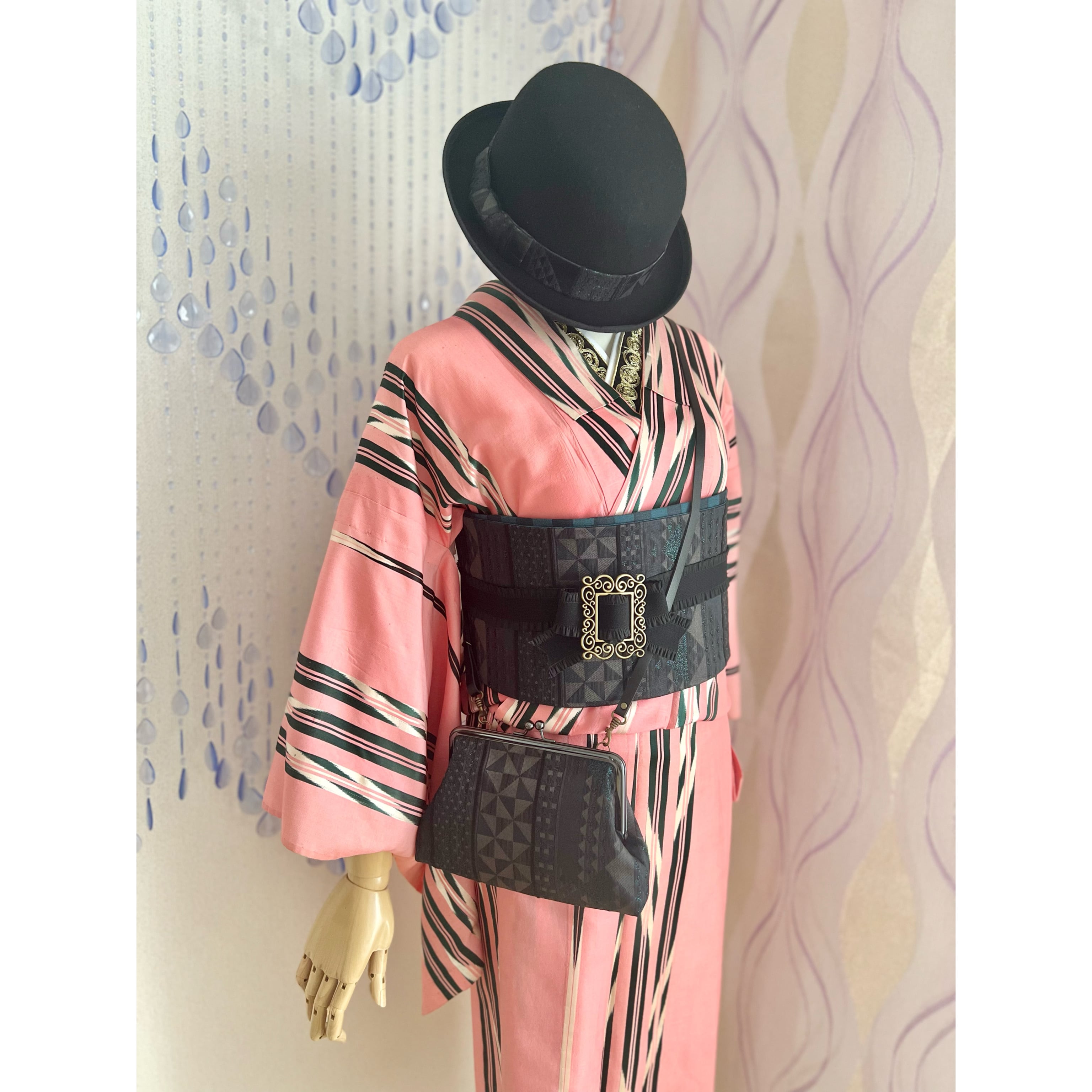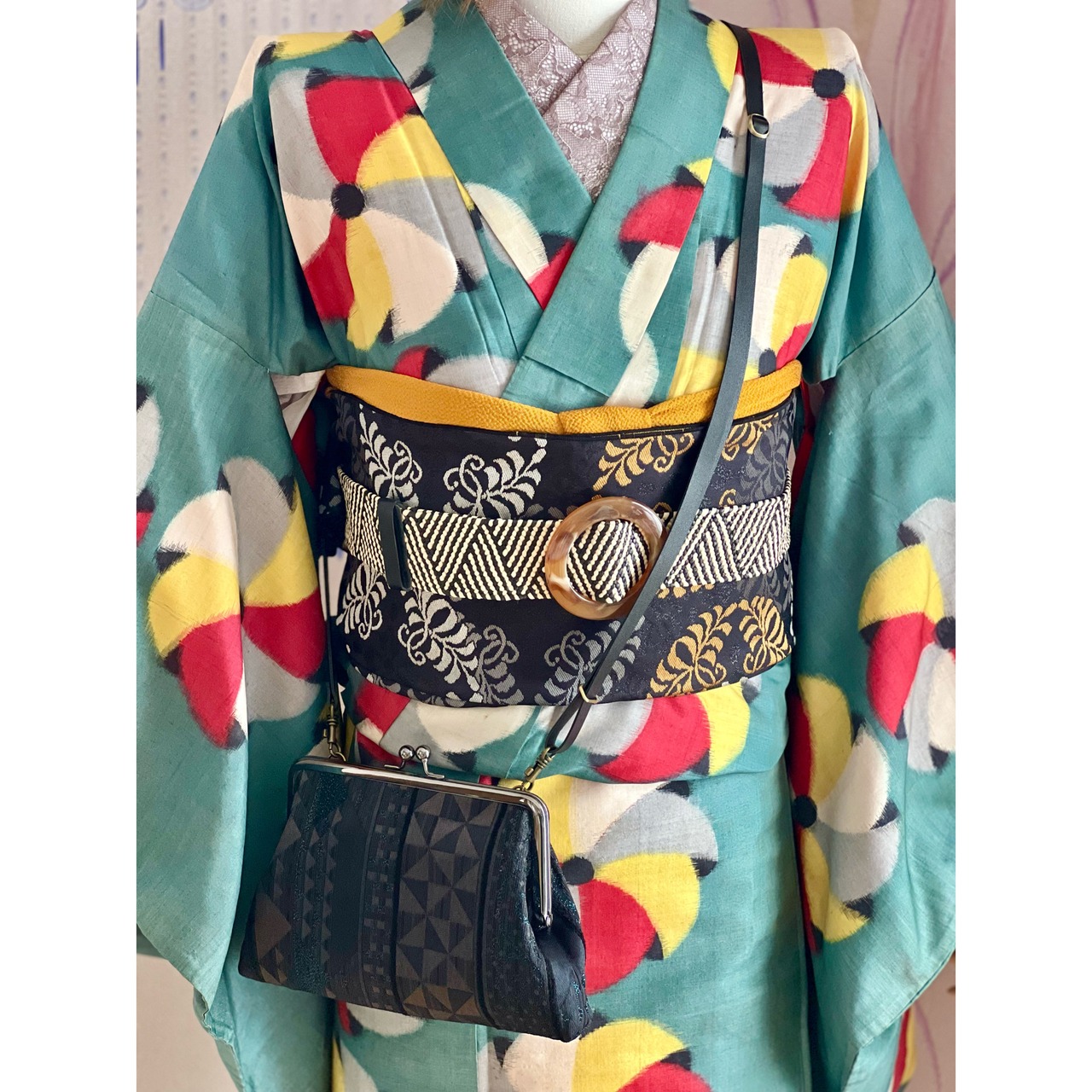 幾何学的な鱗モチーフのデザインを現代的な色みで織り成した生地は、和装のみならず、洋服でも違和感なくお使い頂けます。