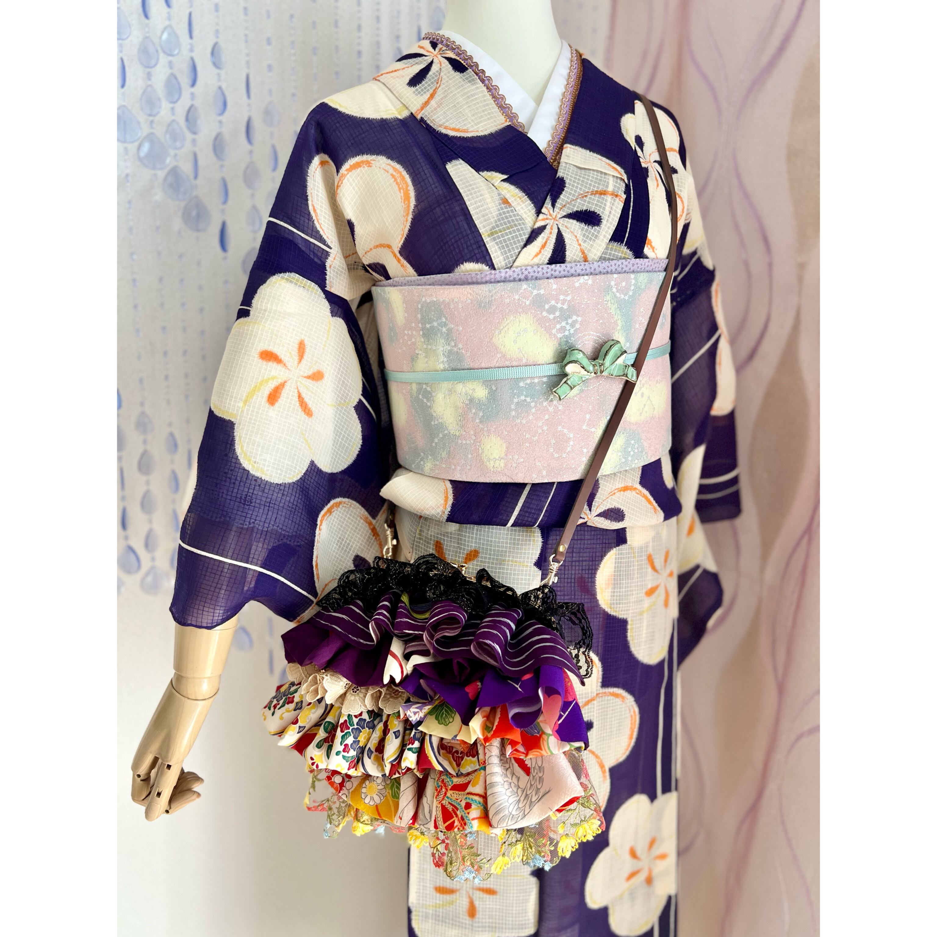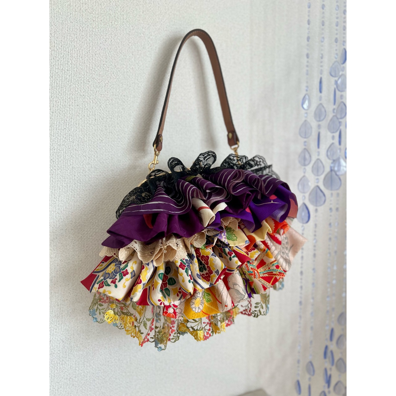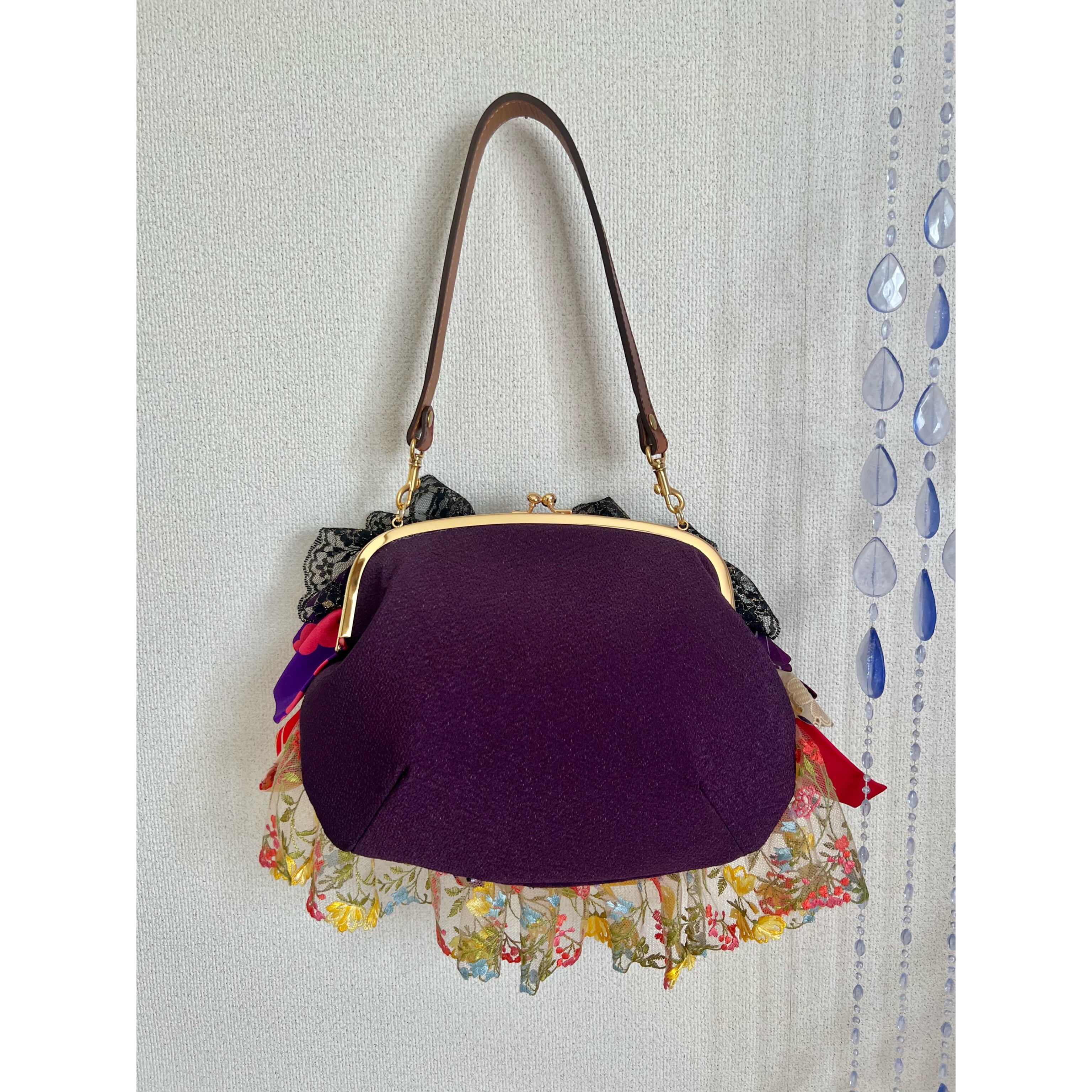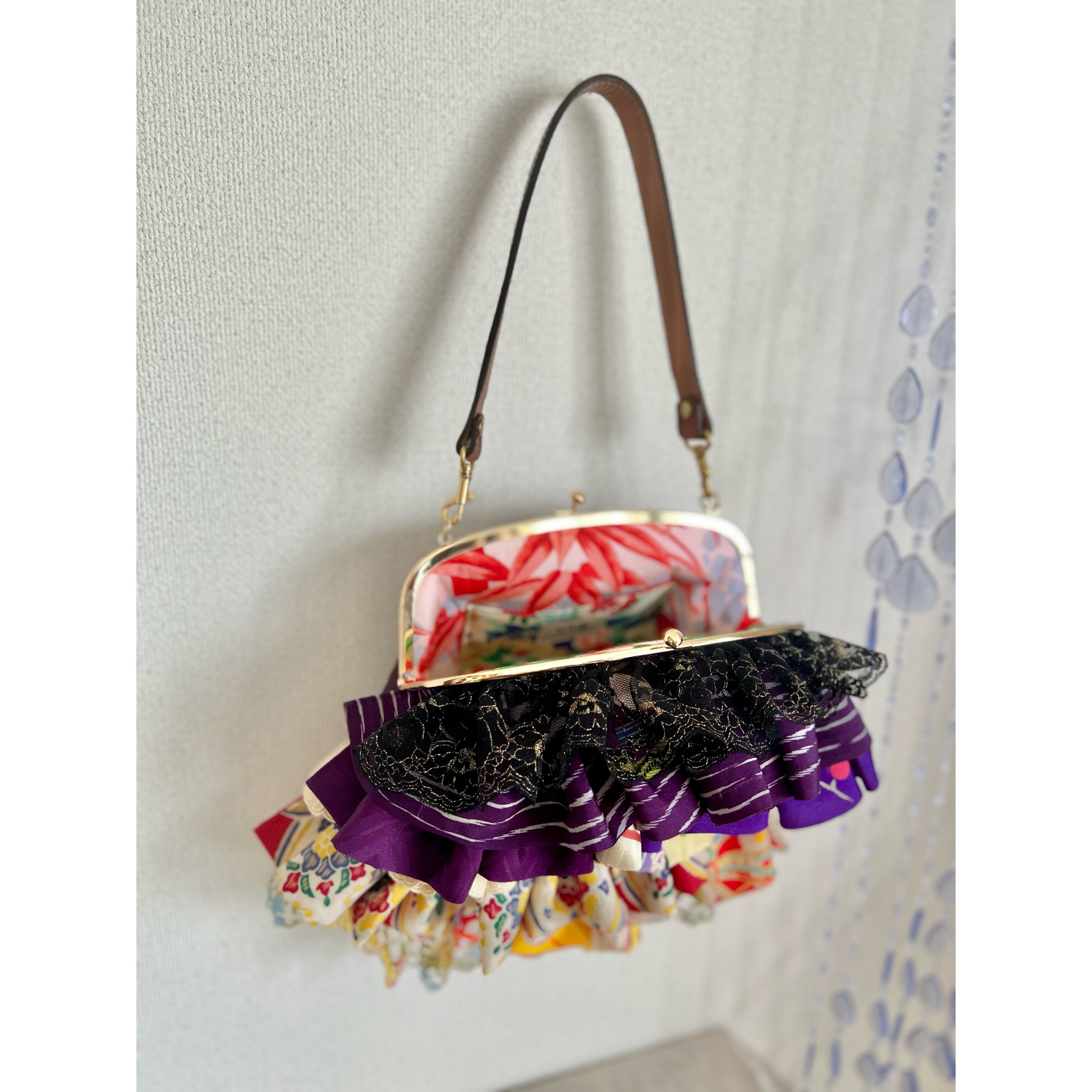 アンティークの古布にレースを合わせ、盛りモリにフリルをよせた、ゆめかわレトロな主役バッグ